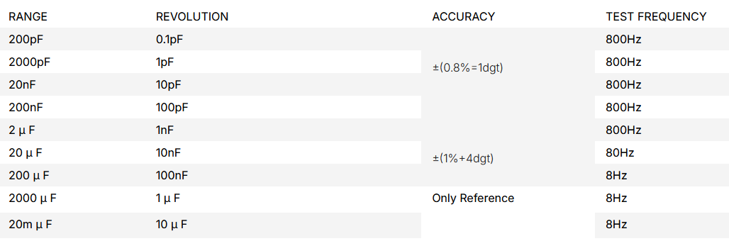 Display: 3 ½ Digits. Four Measuring Units : pf, nf, μ F, mf. Low Battery Indication,. Data Hold Function. Fuse Protection. Zero Adjustment knob for all Ranges. Backlight (Automatic Shutdown after 10 Seconds). Power Supply: 1×9 Volt Battery. Display Size : 64 X 35 mm. Unit Size : 185 X 90 X 53 mm.