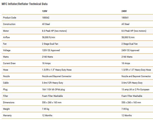 The MFC Inflator/Deflator can be used for rapid inflation/deflation of our inflatable product range from water rescue products to our larger inflatable shelters. The inflator/deflator comes fitted with a robust outer steel casing, two heavy duty commercial motors and a twin fan motor assembly which ensures 100% duty cycle for continuous inflation/deflation.