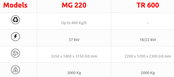MG 220 is associated with the 400/3650 loading belt and TR 600 or 800 shredder. The addition of the shredder and the loading belt allows to increase both the volume and the variety of the material treated, to offer to the end user a simple, fast and highly technological process.