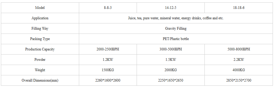 2. This series of products are the integrated rinsing, filling and capping machine, suitable for producing various PET bottled carbonated beverage.