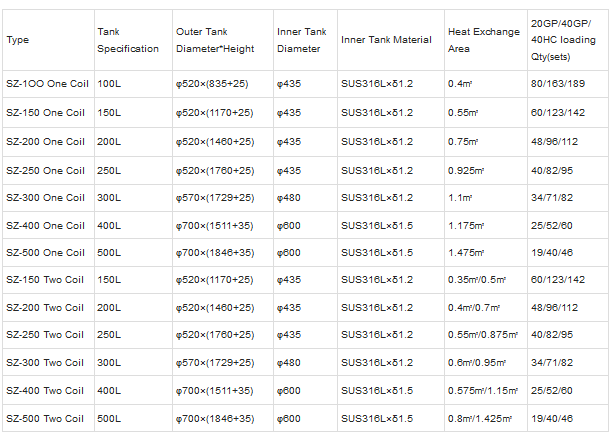 - Inner Tank: Stainless steel 1.2mm SUS316L/porcelain inner tank