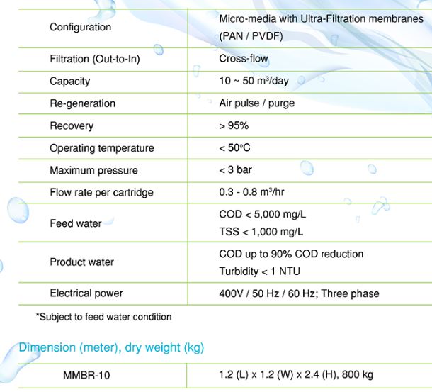 Micro-media in tank and Ultra-Filtration membrane cartridges. 1 x Feed / suction pump Aeration diffusers and blower. 1 x Set of manifolds. 1 x Pressure or suction gauge. 1 x Rotameter. Stainless or epoxy coated steel frame . PVC piping, hoses and quick couplings . Optional Supply: Air compressor, RO membranes, and/or product tank.
