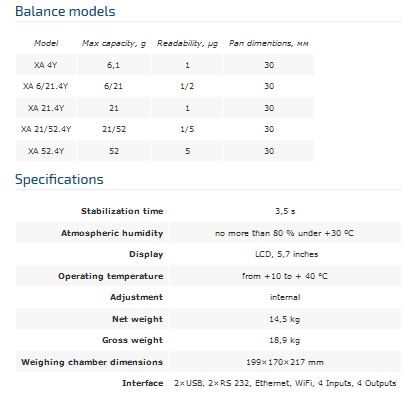 The XA...4Y series is equipped with LCD 5.7" colour touch screen facilitating device operation and presentation of the results. Complex databases enable users to register, print and export measurements. XA...4Y microbalance is an optimized modern device which among many functions features an option of automatic level control. `Defined profiles` is a new function, it automatically sets weighing instrument`s parameters in accordance with user requirements.