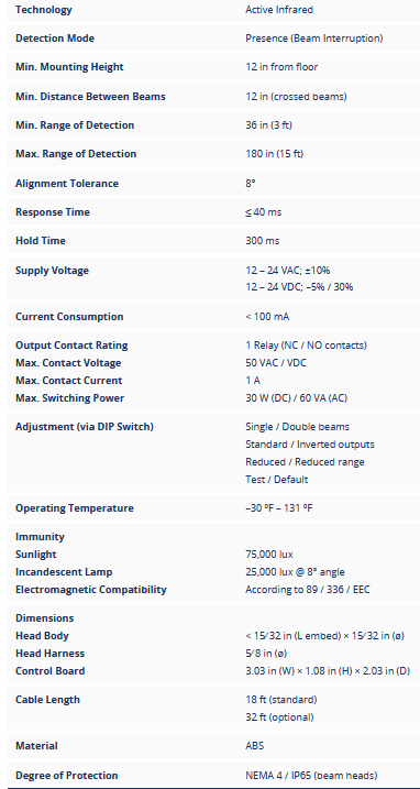 Maximum range of detection of 180 inches, with an 8° alignment tolerance