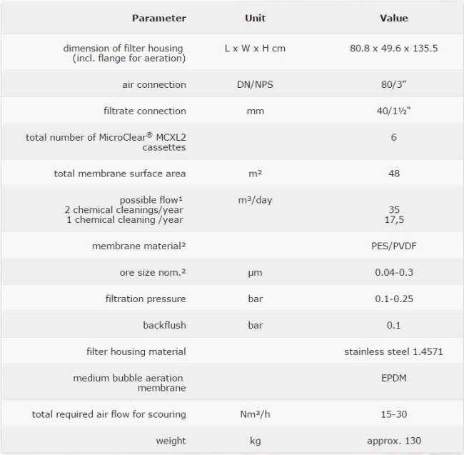 Complete assembled units for biological wastewater treatment with submerged membrane cassettes, including: Membrane cassettes MicroClear MCXL2. Filter housing made of stainless steel 1.571. Membrane plate diffusor for medium bubble aeration in the filtration tank optimized for the plate distance of the MicroClear filters.