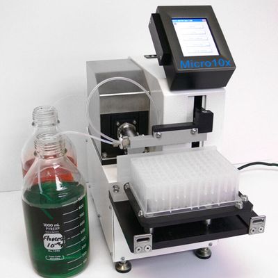 The Micro10x Microplate Reagent Dispenser dispenses liquids in volumes down to 10 microliters, and is the only small dispenser capable of tip-touchoff to ensure a clean dispense of high surface-tension fluids. Its ceramic positive-displacement pump head is adjustable in increments of 10nL and never requires recalibration. The leading competitor needs constant calibration and the purchase of replacement dispensing cassettes. The Micro10x microplate dispenser can be used as a stand-alone laboratory instrument or integrated into a laboratory workstation.
