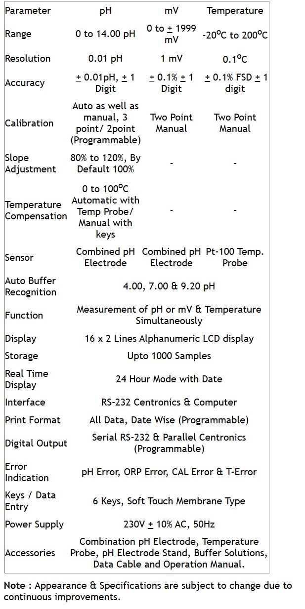 Microprocessor Based pH Meter (Model : VSI-101) is a high performance instrument for accurate, reliable & precise pH & Temperature or mV & Temperature measurements simultaneously. The microprocessor technology and advanced engineering techniques used, give enhanced accuracy and reproducibility. The instrument has in-built error codes which alert you to incorrect procedural errors. It has auto buffer recognition facility. Both auto and manual temperature compensation facility is available. It has 6 soft touch membrane type keys for ease of operation. Storage facility for 1000 samples has been provided, which are retained in the instrument`s memory. It also has the provision for the attachment of computer and any dot matrix printer & computer.
