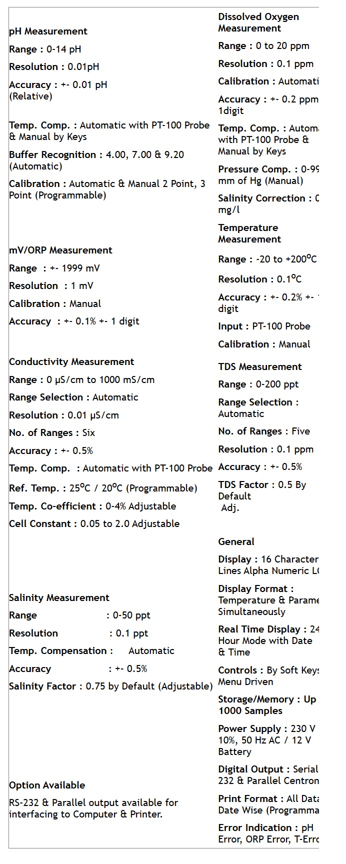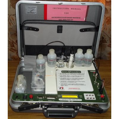 Microrocessor Based Water & Soil Analysis Kit VSI-301 is suitable for measurement of seven parameters i.e. pH, ORP, Conductivity, TDS, Salinity, D.O. & Temperature. The Mains/Battery operated kit is housed in a rugged fibre glass briefcase with provision to keep all the accessories inside. A 12V Rechargeable battery is provided within the kit that makes it extremely useful for field and laboratory use.