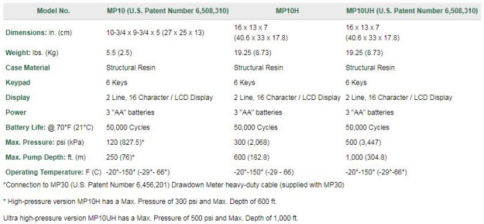 - Exclusive drawdown control via link to optional MP30 (U.S. Patent Number 6,456,201) Drawdown/Water Level Meter, which signals MP10 Controller to enter paused pumping when drawdown limit is exceeded.