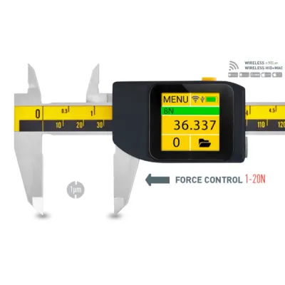 MICROTECH update calipers with electronic multi-Force control module, that gives possibility measure all time with a same Force. Measuring Force can be selected throw menu in range 1-20N. Automatic Force mode gives possibility saving to memory or transfer to app actual value upon reaching a given Force (1-20N). Patented e-Force technology improving accuracy of caliper and automized measuring process.