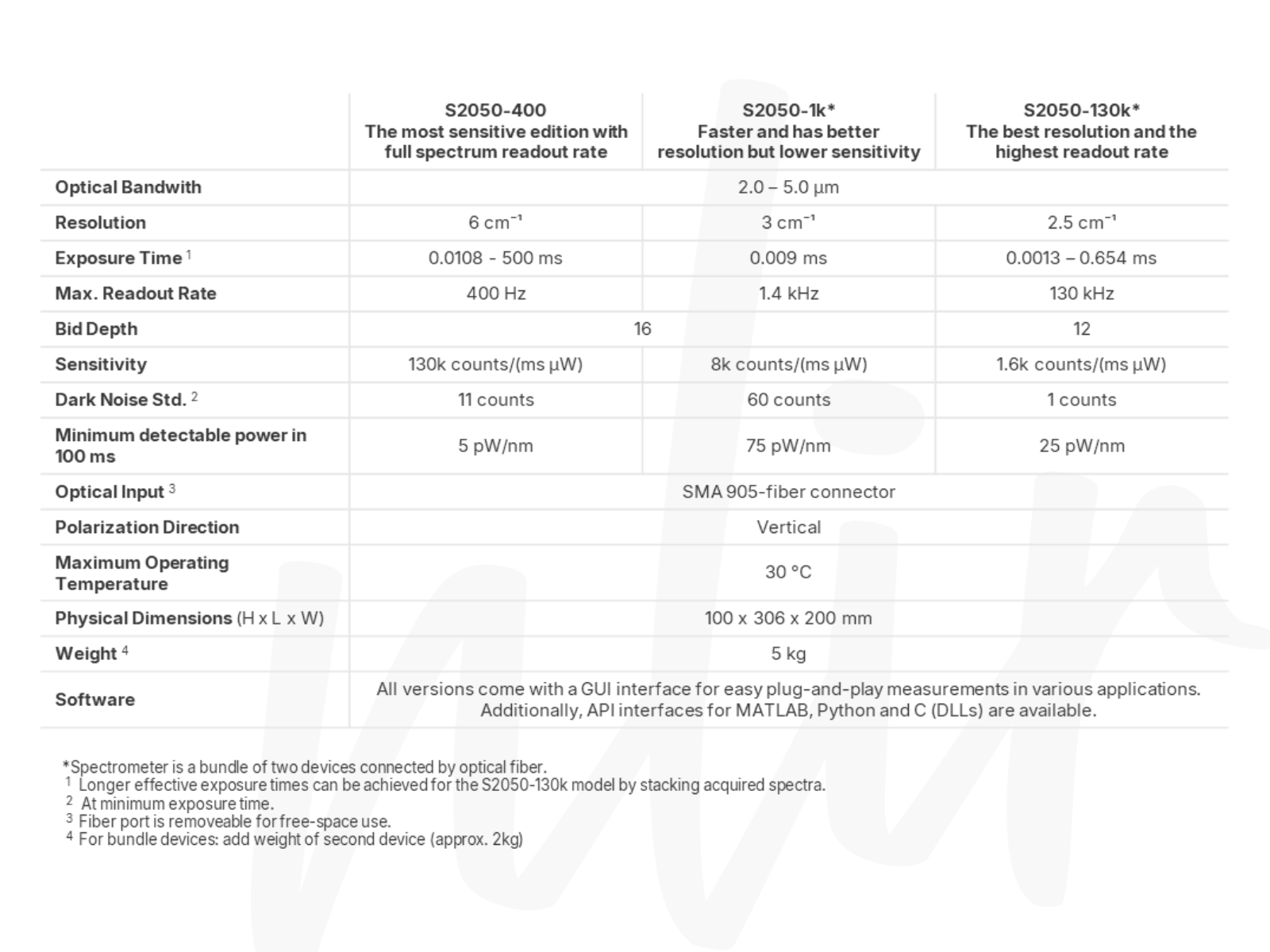 - API for spectrometers in MATLAB and Python available upon request.