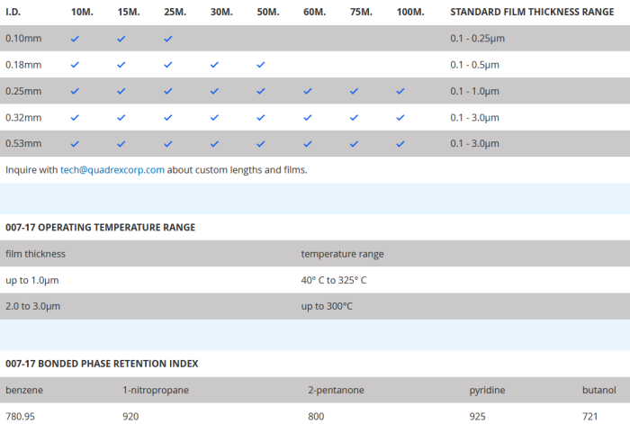 007-17, (50% Phenyl) Methylpolysiloxane columns are available in all standard column I.D.`s and lengths. The film thickness ranges are noted in the chart below.