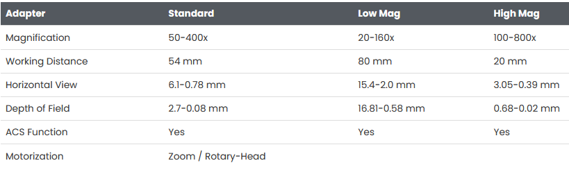 Available in both Motorized and Manual versions. This universal lens can be equipped with a wide selection of optical adapters. Attaching the rotary head adapter allows 360 Degree revolution with the ability to inspect at multiple angles. The various exclusive adapters snap on, allowing one-touch replacement and a magnification range that expands observation from 20x-800x.