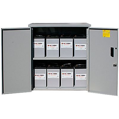 Our Best Value! Battery Enclosure with locking door and two shelves. MNBE-D holds 8 GVX3050T or 8 golf cart or 8 group 31 batteries. With the optional third shelf, the MNBE-D holds 12 group 31 batteries. MNBE-D battery enclosure accepts MNEDC175 or 250 breakers. Gray powder coated steel. The image shows 8 GVX3050T batteries. Ships knocked down in two boxes.
