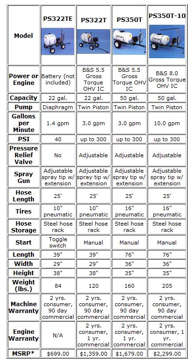 There are two lines of sprayers: battery powered and gas powered. The battery powered sprayers are quiet and lightweight to move around. The gas powered sprayers have more power which allows them to spray farther and spray more material per minute.