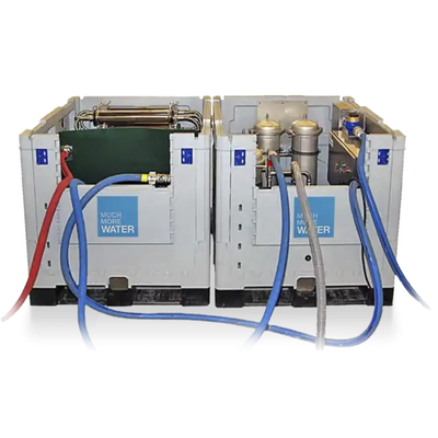 Military grade water purification plant with EMC protection*. This unit has a daily capacity of 96000 litres per day, giving 5 litres of drinking water for 19200 people, or 4800 pcs 20 L bottles. Patented and uniquely versatile 3-in-1 unit with RO purification production of 4000 l/h. Using the activated carbon (and 100, 25 and 5 micron filters) or the UV light purification part of the system, the system will produce 8000 l/h.