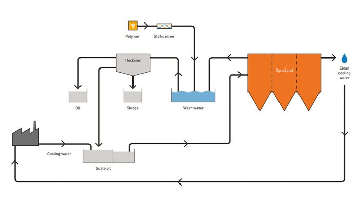 In these types of application, the flow rates for DynaSand filters are usually in the range of 20-30 m/h. The mill scale contents processed often amount to a full 400 mg/l. This process is also relatively insensitive to oil emulsions and has proved to be very effective at separating them too.