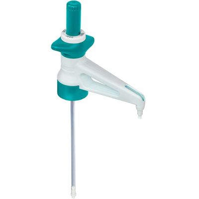 The mini bottle dispenser is used for quick and easy dispensing of liquids in volumes of either 500 μl or 1000 μl, its standard thread size is 1 inch (26 mm). The output volume can be selected by twisting an adjustment wheel and then operating the centrally mounted plunger. After refilling, the bottle dispenser can be vented through repeated pumping of the piston. The bottle is then ready for repeated use. The bottle dispenser has no metal valves and is made from shatterproof polypropylene with very high chemical resistance. Cleaning can be done by a damp cloth, using soapy water solution if necessary.