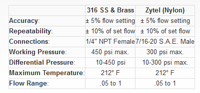 - Body Material: 316 Stainless Steel, Brass, Zytel (Nylon)