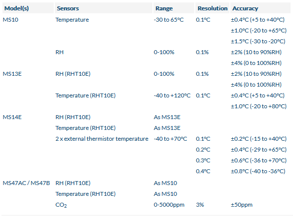 RHT10E high spec RH and temperature probe can be placed precisely where needed. MS14E additionally provides two temperature (thermistor) inputs.