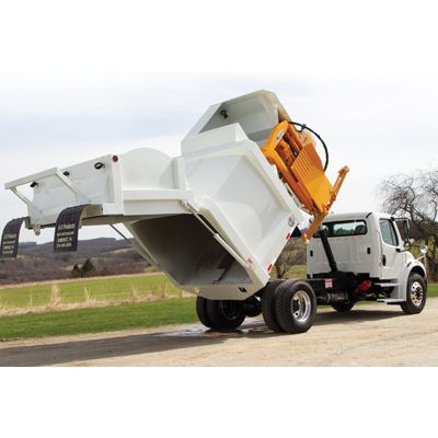 Low container dump height with a shrouded hopper to reduce blown debris. Lift arm horizontal and vertical supports are centered in relationship to the hopper and the load to be lifted — this means less wear and fewer parts to be replaced. L.E.D. body and work lights along with up to four optional cameras for operator safety and ease-of-operation.