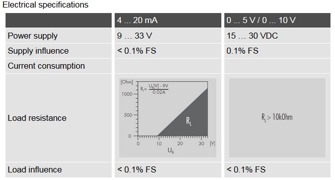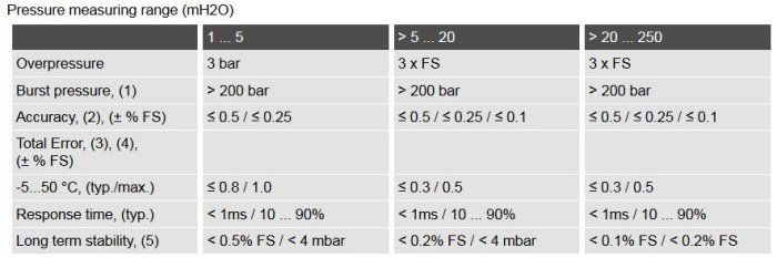 Pressure measuring range: 1…250 mH2O. Accuracy: ≤ ± 0.50 / 0.25 / 0.10 % FS. Operating temperature: -5…80 °C. Process temperature: -5…80 °C. Output signal: 0 … 5 / 0 … 10 VDC, 4 … 20 mA. Materials: Stainless steel. 19 mm outside diameter.
