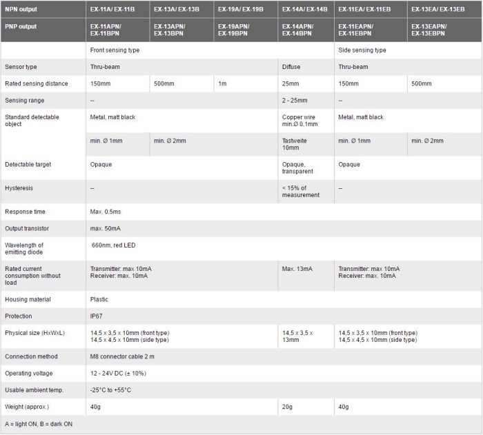 With dimensions of only 14.5 x 3.5 x 10mm, the EX-10 series sensors are among the smallest and narrowest sensors worldwide. Despite their ultraminiaturized design, the maximum range of the thru-beam version is 1000mm yielding an exceptionally high performance. The EX-10 series is available in two different basic designs, with a front sensing or side sensing light source, which additionally extends the mounting options in narrow spaces.