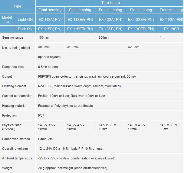 Like the EX-10 series, with the dimensions of only 14.5 x 3.5 x 10mm, the EX-10S series sensors are among the smallest and narrowest sensors worldwide. This S version with a thinner beam allows the detection of small objects within a very narrow detection zone.