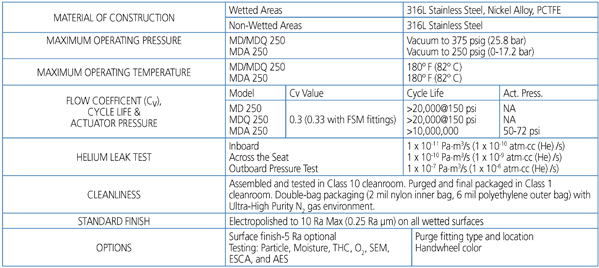 This MD (diaphragm design) is designed for point of use, high performance gas and chemical distribution systems where purity, high flow characteristics, combined with the lowest operating costs, make this valve an excellent consideration for: Gas Cabinets, Valve Manifold Boxes, Gas Isolation Boxes. Point of Use connection gas sticks. Process tools. Bubbler systems including canister isolation valves. Bulk gas system purge valves.