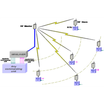 The MINILINER has been designed to serve as a wireless bridge between any commanding unit and remote actuators and sensors. The unit can handle 4 outputs arriving from the commanding unit and return 4 inputs arriving from the field. The input/output terminals of the MINILINER are connected back to back with the input/ output terminals of the commanding unit. For reaching the remote actuators and sensors the system uses radio communicated Remote Terminal Units (RTU). Connected to the MINILINER there is an RF Master that carries out the communication to the RTUs via the RF Slave connected to each RTU. More information about the RF system can be found in the "RF RTU system guide 2007"