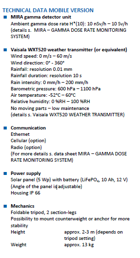 The MIRA WEATHER STATION is a combination of a MIRA gamma dose rate monitoring station and a Vaisala weather transmitter. The MIRA collects the data from the weather transmitter and store it in its internal memory. The data from the MIRA and the weather transmitter are transferred by the MIRA to the monitoring center by Ethernet, Cellular and/or Radio. The combination of the MIRA and Vaisala weather transmitter offers the possibility of easy gamma dose rate monitoring and detailed weather monitoring.