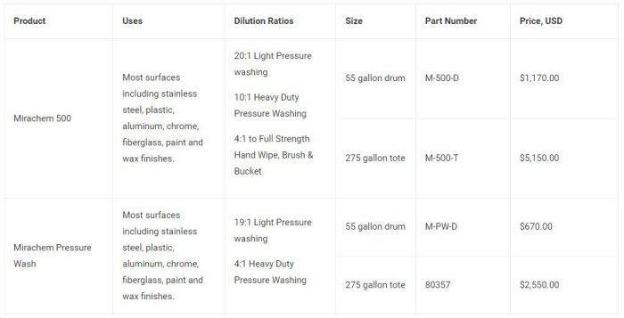 Mirachem is a highly concentrated, environmentally safe cleaner engineered to lift oil, grease and road film from surfaces to be rinsed away with water. This sudsing formula is designed to increase dwell time and prevent re-depositing. It can be used on most surfaces including stainless steel, plastic, aluminum, paint and automotive wax finishes.
