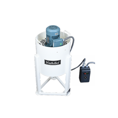 The built-in suction fan driven by an induction motor provides a powerful suction which sucks the mist into the Mistkiller™ through the exhaust port of the generating equipment and the connecting PVC duct. A prefilter(optional) consisting of a small chamber with aluminium flakes provides the initial gross filtration of the mist. The high speed rotation of the special suction fan generates a centrifugal force which throws the mist against the inner side of the Mistkiller™ enclosure. The mist condenses under this pressure and the collected liquid flows down through the PVC duct and returns to the generating equipment for re-use. The outlet of the Mistkiller™ is provided with foam/steel media used as a postfilter. The equipment requires just periodic washing of the mesh prefilter and the foam/steel postfilter with a high pressure water jet.