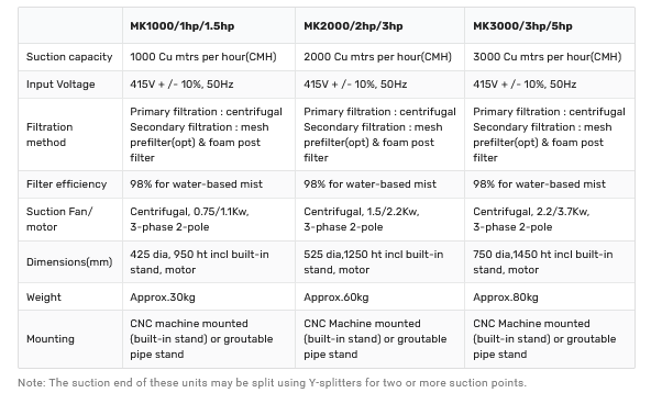 Mistkiller™ can be used effectively for the capture and control of mist generated by the use of water-based liquids, typically from CNC and non-CNC machining, cleaning chambers, spraying systems, etc. The mist condenses inside the Mistkiller™ and the condensed liquid may be drained out into the generating equipment for re-use.