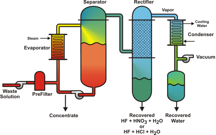 Beta uses vacuum evaporation to filter contaminants and to concentrate mixed acids for reuse. Our recovery system works continuously to maintain your acid at its optimum concentration and purity.