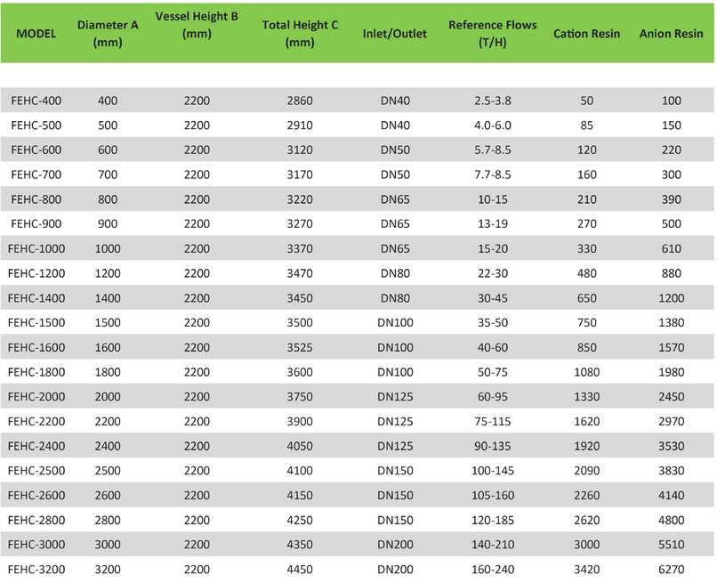 Diameter A (mm): 300. Vessel Height B (mm): 2200. Total Height C (mm): 2810. Inlet/Outlet: DN 22. Reference Flows (T/H): 1.4-2.1. Cation Resin: 30. Anion Resin: 55.