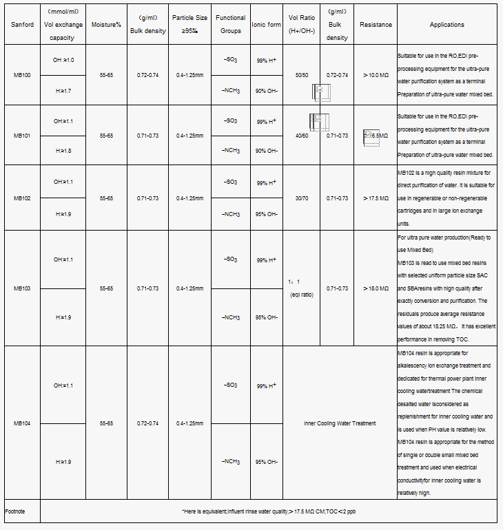 Mixed Bed Resin,resin mixture of cation in H+ and anion in OH ,for the production of pure and ultra pure water.