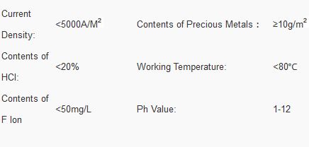 Initial chlorine evolution potential (Saturated NaCl, ID=3kA/m2):≤1.10V vs SCE.
