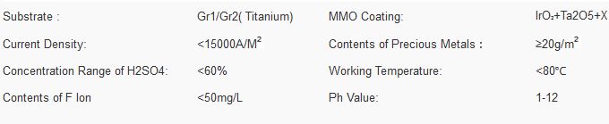 The substrate mainly adopts CP titanium and can be processed to any shape or dimension precisely. During its working, the dimension is always stable which not only guarantee the steady operation of the electrode and the equipments under the constant voltage for long time, but also can guarantee the high purity of the final product.