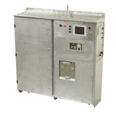 Designed to be capable of disinfecting two sources of water simultaneously using an injection process, with minimal operator attention. Electrically operated, package-type (bulkhead-mounted) unit ready for operation (turn-key system) with a footprint of 48 inches wide x 12 inches deep x 48 inches high. Uses granular or pellet salt (sodium chloride) and potable water as inputs to produce a concentrated disinfectant solution in an electrolytic cell. The disinfectant solution is metered into the discharge from the ship’s desalination plants as an initial disinfectant and/or metered into recirculated water from the ship’s potable water tanks to replenish the level of disinfectant in the tanks.