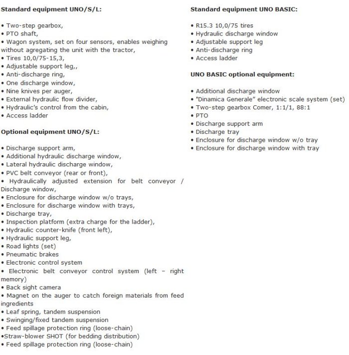 Range dedicated for small and medium farms. Thanks to twospeed transmission, power consumption is significantly lower. Patented auger geometry shortens time of mixing by 15%. Wide range of standard equipment and large number of optional accessories make the OptiFEED UNO a versatile machine.