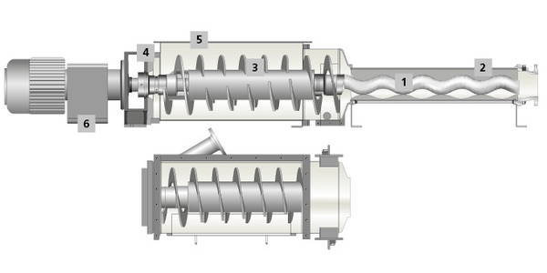 5 Funnel Housing : Optimal positioning of the conveying supports allows for maximum mixing of the substrate. Removable conical force-feed chamber with an opening for inspection or feeding simplifies cleaning and maintenance and allows for additional product input. Hopper can be optionally coated to protect against abrasion and corrosion.