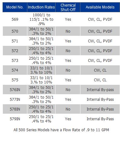 The MixRite 500 Series Water Driven Injectors are designed for water flow up to 11 gpm (2.5m3/hr) and will operate from .8 to 11 gpm (3-41 L per min.). The 500 series is available as a CW model with seals and components for mildly aggressive additives, CL models for corrosive materials, acids, alkalines and solvents and a PVDF model for the most aggressive additives.