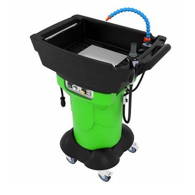 The mobile and multifunctional parts cleaner is ergonomically designed and works with compressed air. It cleans machine parts or brake mechanisms without using solvents and avoids dust formation.