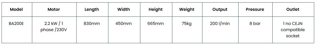 The Factair BA200E is a single phase electrically powered, breathing-air compressor designed to operate from a safe area providing air to those working in hazardous environments. The BA200E incorporates a rotary vane compressor powered by a single phase electric motor c/w a DOL starter. The compressed air generated is passed through a fan assisted aftercooler before proceeding through a multi-stage filtration system which removes particulates, reduces oil contamination to <0.003 parts per million and also removes hydrocarbon vapours.