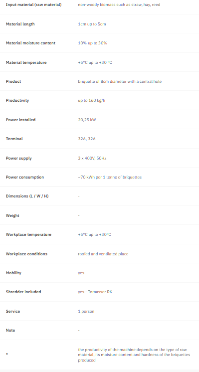 - you make usage of higher moisture content - the exceptionality of Biomasser technology is that it processes the raw material without any additives, adhesives, flours, binders and of moisture content of up to 30% what means that it does not need to be dried before briquetting – it’s a unique feature by world standards.
