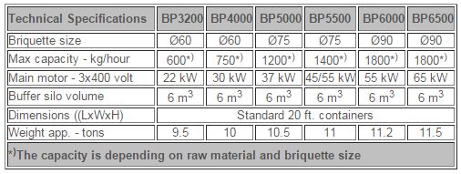 - Self contained plant including briquetting press, silo, discharge system,