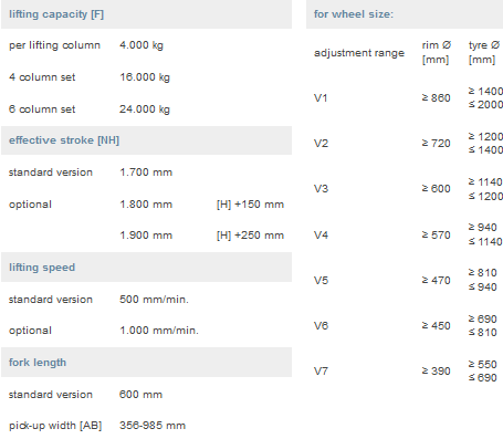 - lifting capacity: 4.000 kg each lifting column standard version: 4 column set with 16.000 kg lifting capacity (other column sets on request)