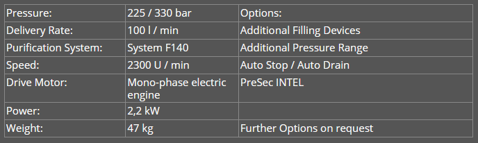- filling unit with DIN connector G 5/8" für 200 bar, end pressure gauge and 1m filling hose with self-venting filling valve and safety valve 225 bar