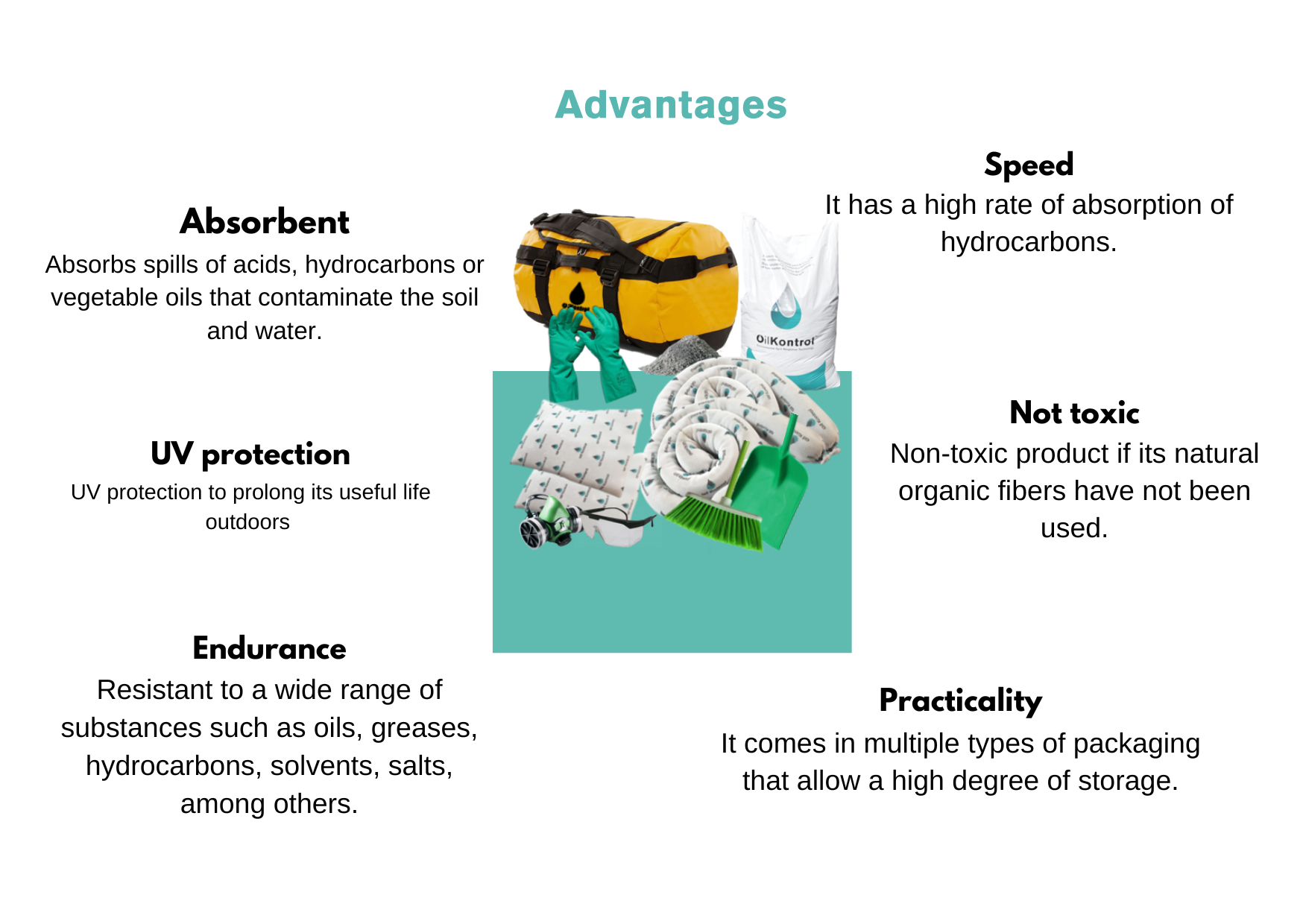 Absorption and encapsulation capacity of up to 7 liters of hydrocarbon per kilo of fiber, 1 cushion composed of oleophilic fabrics filled with bio-absorbent collagen material, 100% organic, oleophilic, hydrophobic, fireproof, harmless to the environment, with a specific weight of 0.20 g/cm3. Absorption capacity of 7ltrs of hydrocarbon per cushion, non-leaching, 1 bag of 1kg bio-absorbent collagen, 100% organic, oleophilic, hydrophobic, fireproof, harmless to the environment, with a specific weight of 0.20 g/cm3. Absorption and encapsulation capacity up to 7ltrs of hydrocarbon per kilo of fiber, 1 pair of nitrile gloves No. 9, 1 xxl disposable hydrocarbon-resistant panties.